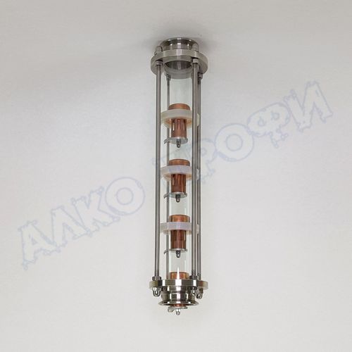 Корпус - кварцевое стекло 5мм. Тарелки - пищевая медь. Фланцы - пищевая нержавеющая сталь AISI-304.