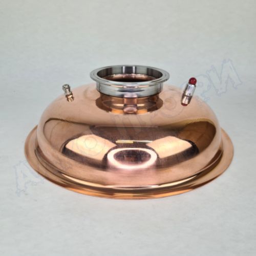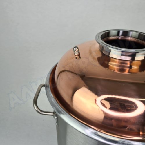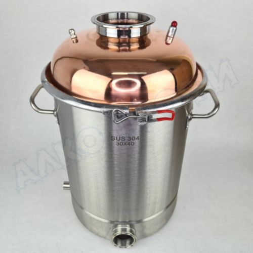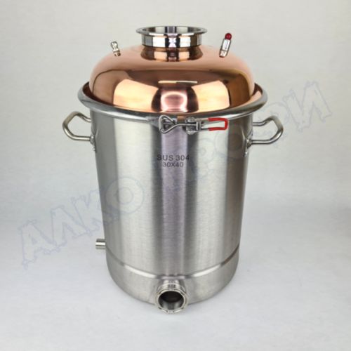 Перегонный куб из пищевой нержавеющей стали AISI 304 кастрюльного типа с крышкой из меди отечественного производства. Используется с дистилляторами (самогонными аппаратами) в качестве емкости нагрева спиртосодержащих жидкостей.