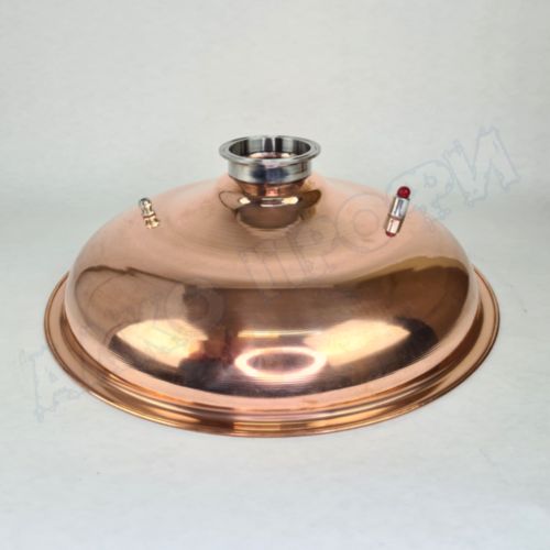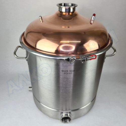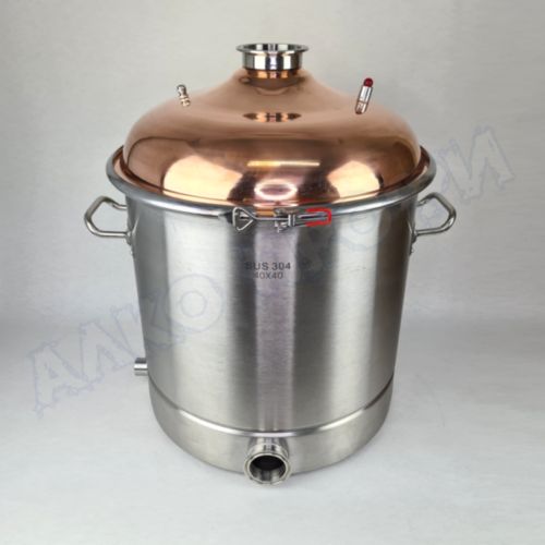 Перегонный куб из пищевой нержавеющей стали AISI 304 кастрюльного типа с крышкой из меди отечественного производства. Используется с дистилляторами (самогонными аппаратами) в качестве емкости нагрева спиртосодержащих жидкостей.