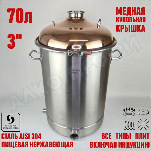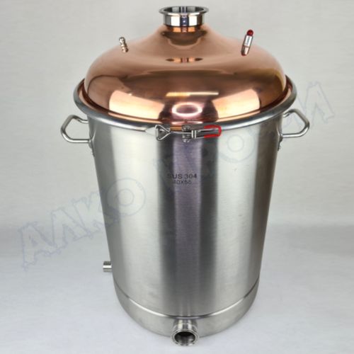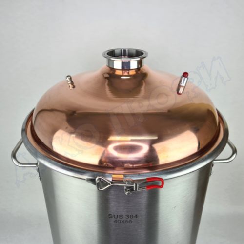 Перегонный куб из пищевой нержавеющей стали AISI 304 кастрюльного типа с крышкой из меди отечественного производства. Используется с дистилляторами (самогонными аппаратами) в качестве емкости нагрева спиртосодержащих жидкостей.