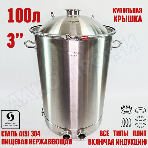 Перегонный куб из пищевой нержавеющей стали AISI 304 кастрюльного типа. Используется с дистилляторами (самогонными аппаратами) в качестве емкости нагрева спиртосодержащих жидкостей.