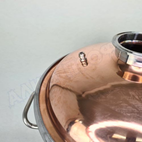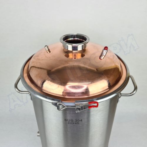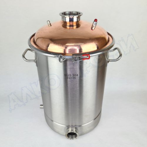 Перегонный куб из пищевой нержавеющей стали AISI 304 кастрюльного типа с крышкой из меди отечественного производства. Используется с дистилляторами (самогонными аппаратами) в качестве емкости нагрева спиртосодержащих жидкостей.