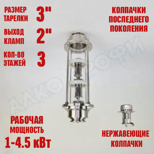 Колпачковая колонна (флейта) 3"(с клампом 2") представляет из себя флейту с тарелками и стёклами 3" и с фланцами с выходом 2". То есть вы получаете размер и мощность колонны 3", но с выходом 2". Кламп 2" универсален и совместим с аппаратами любого производителя.