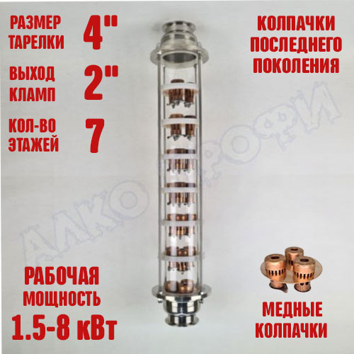 Колпачковая колонна (флейта) 4"(с клампом 2") представляет из себя флейту с тарелками и стёклами 4" и с фланцами с выходом 2". То есть вы получаете размер и мощность колонны 4", но с выходом 2". Кламп 2" универсален и совместим с аппаратами любого производителя.
