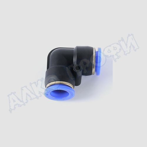 Быстросъем соединитель 10мм угловой - Соединитель для соединения двух полиуретановых трубок соответствующего наружного диаметра. Имеет цанговые быстросъёмные соединения. Угол 90 градусов.